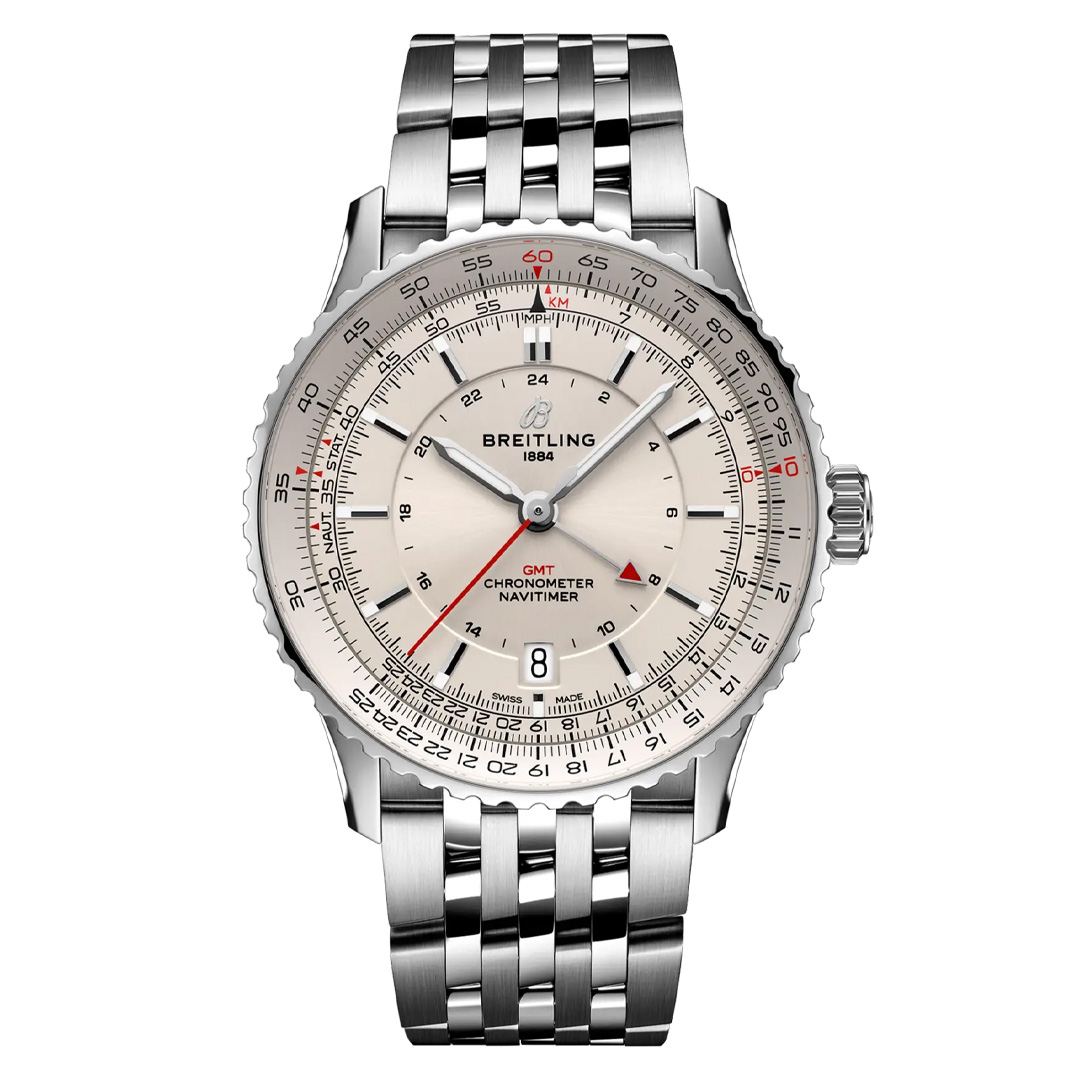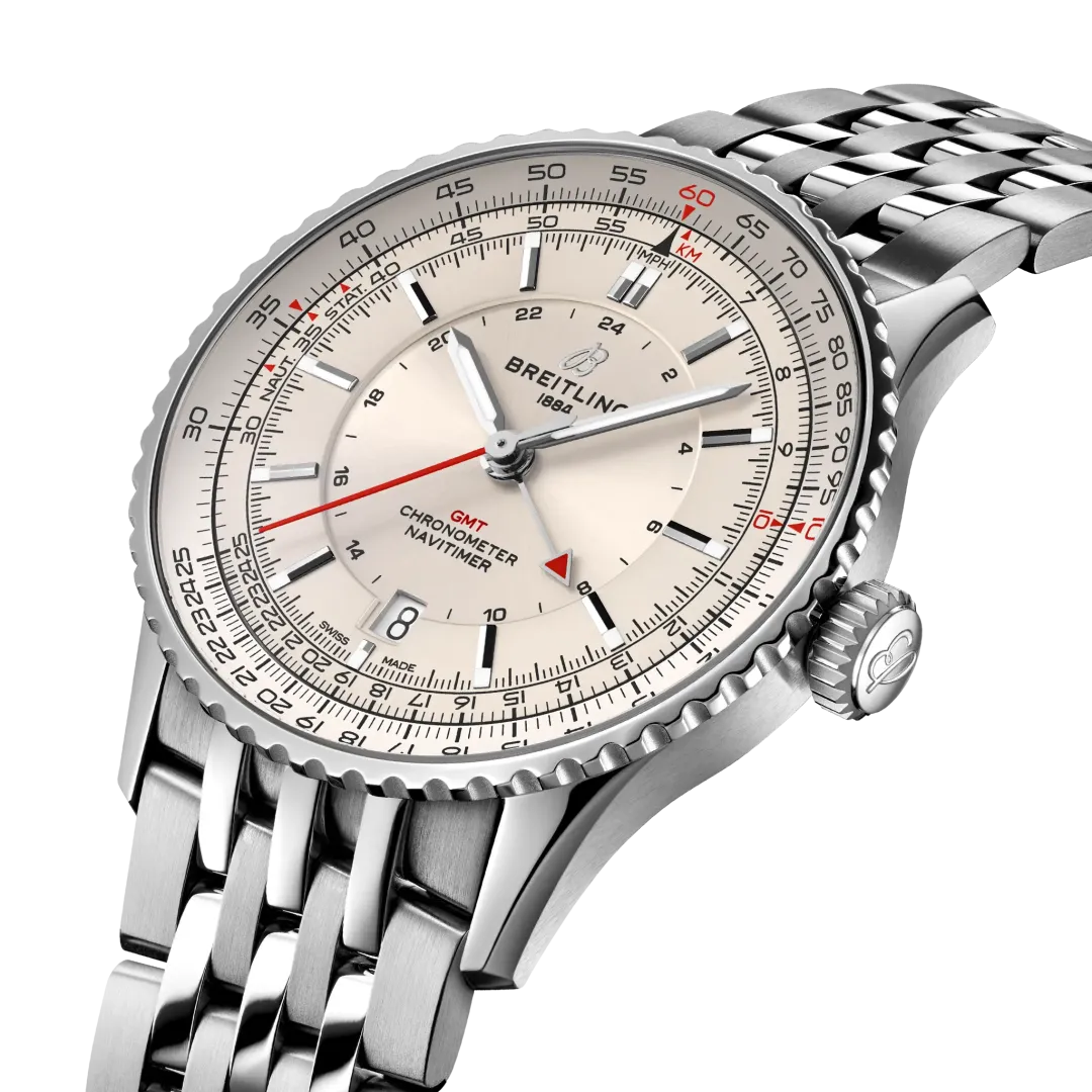 Entdecken Sie bei Juwelier Hermann Schmidt die Navitimer GMT – eine stilvolle Verbindung aus Tradition, Technik und Weltgewandtheit.
